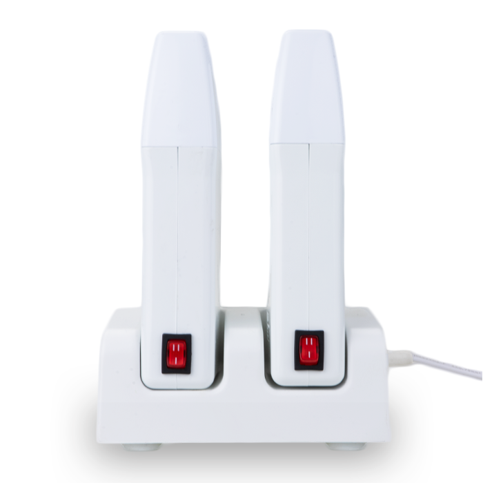 De Dubbele Roll-On Waxverwarmer beschikt over twee oplaadpoorten en wordt geleverd met twee draadloze Roll-On Waxverwarmers. Elke verwarmer verwarmt gelijktijdig twee eenmalige waxcartridges met één simpele druk op de knop.
